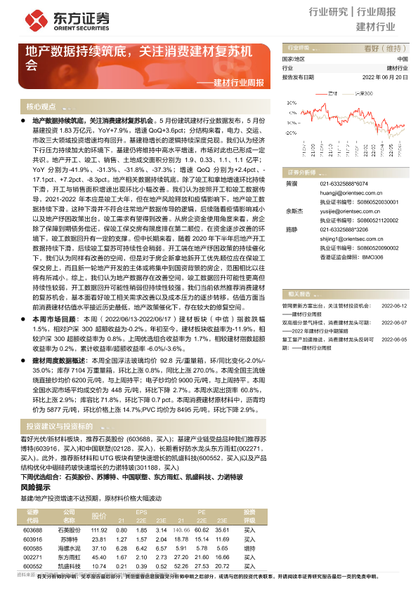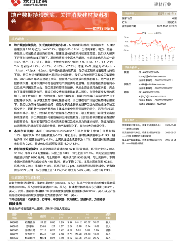 【东方证券】【20220620】建材行业周报:地产数据持续筑底,关注消费建材复苏机会-21页