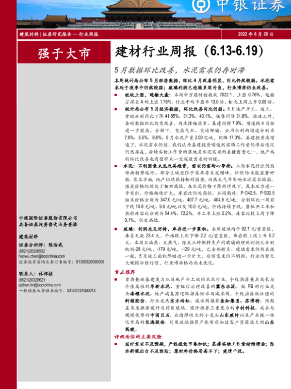 【中银证券】【20220620】建材行业周报:5月数据环比改善,水泥需求仍存时滞-19页