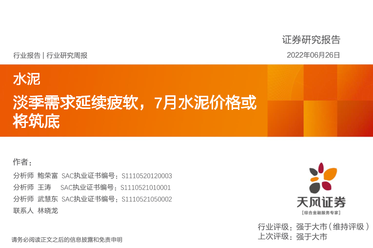 【天风证券】【20220626】水泥行业研究周报:淡季需求延续疲软,7月水泥价格或将筑底-20页