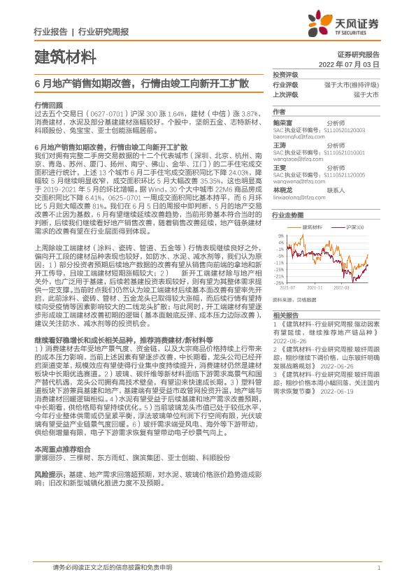 【天风证券】【20220703】建筑材料行业研究周报:6月地产销售如期改善,行情由竣工向新开工扩散-6页