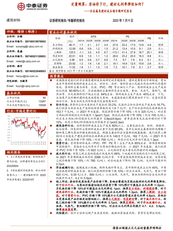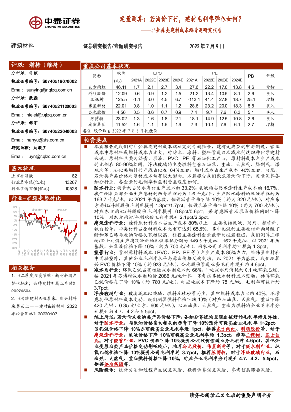【中泰证券】【20220709】定量测算:若油价下行,建材毛利率弹性如何?-15页
