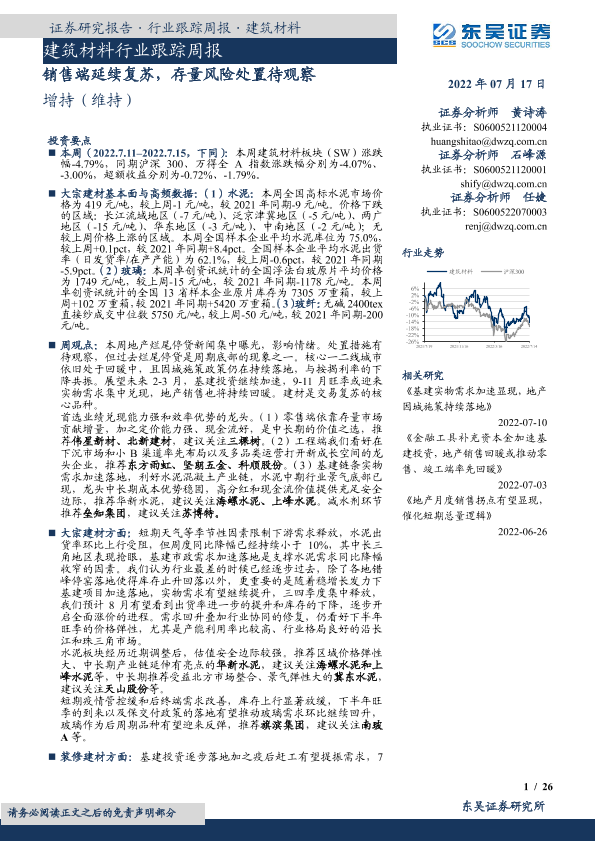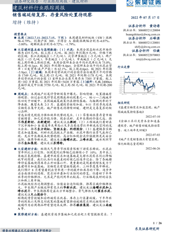 【东吴证券】【20220717】建筑材料行业跟踪周报:销售端延续复苏,存量风险处置待观察-26页