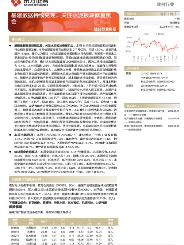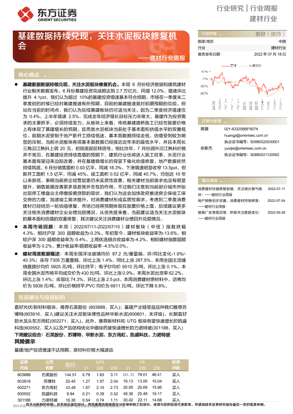 【东方证券】【20220718】建材行业周报:基建数据持续兑现,关注水泥板块修复机会-21页