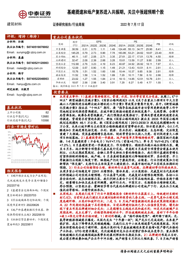 【中泰证券】【20220717】建筑材料行业周报:基建提速和地产复苏进入共振期,关注中报超预期个股-26页
