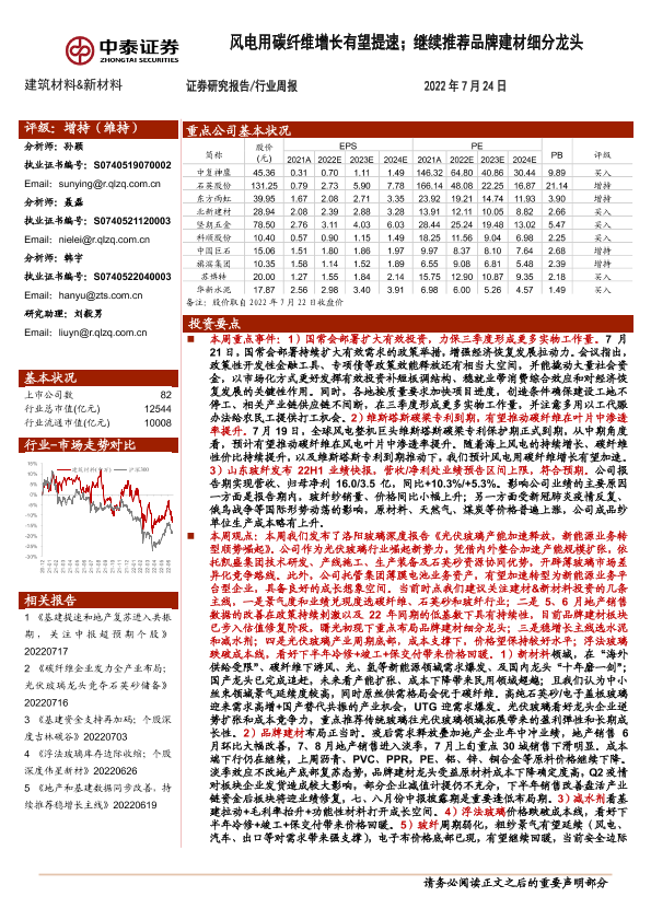 【中泰证券】【20220724】建筑材料&新材料行业周报:风电用碳纤维增长有望提速;继续推荐品牌建材细分龙头-27页