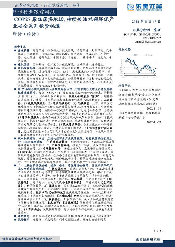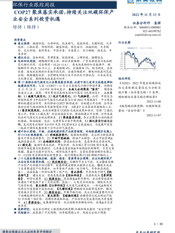 【东吴证券】【20221113】环保行业跟踪周报:COP27聚焦落实承诺,持续关注双碳环保产业安全系列投资机遇-33页