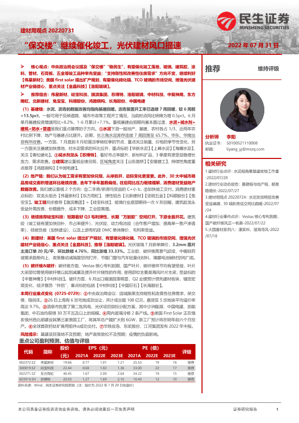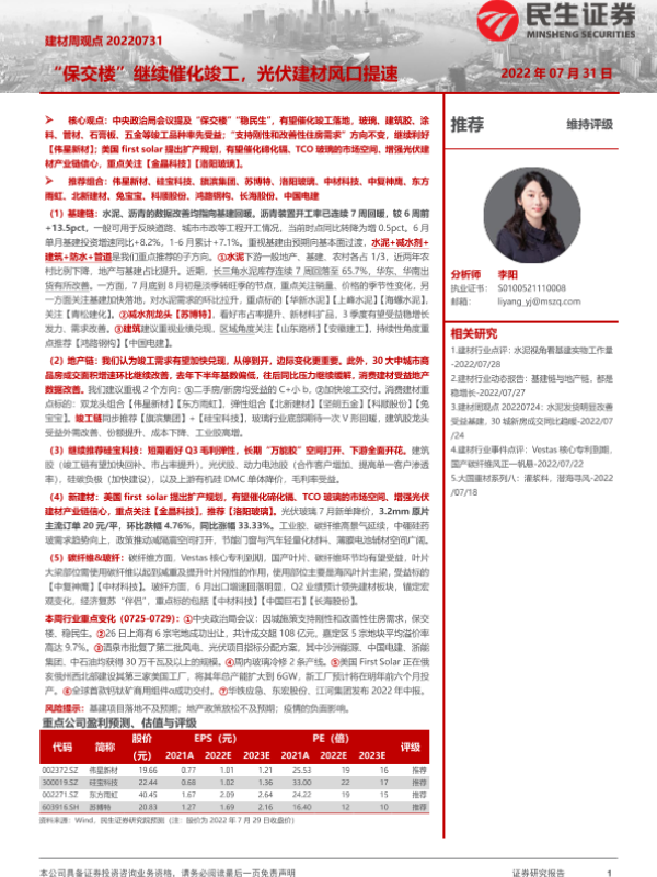 【民生证券】【20220731】建材周观点:“保交楼”继续催化竣工,光伏建材风口提速-20页