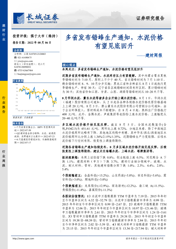 【长城证券】【20220806】多省发布错峰生产通知,水泥价格有望见底回升-20页