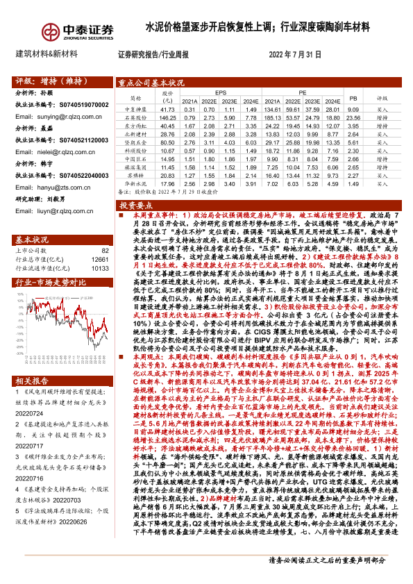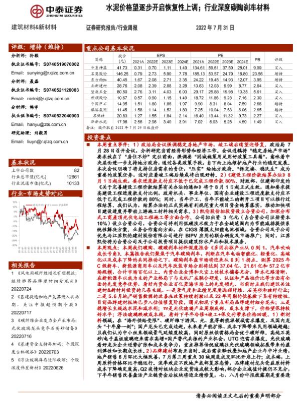 【中泰证券】【20220731】建筑材料&新材料行业周报:水泥价格望逐步开启恢复性上调;行业深度碳陶刹车材料-27页