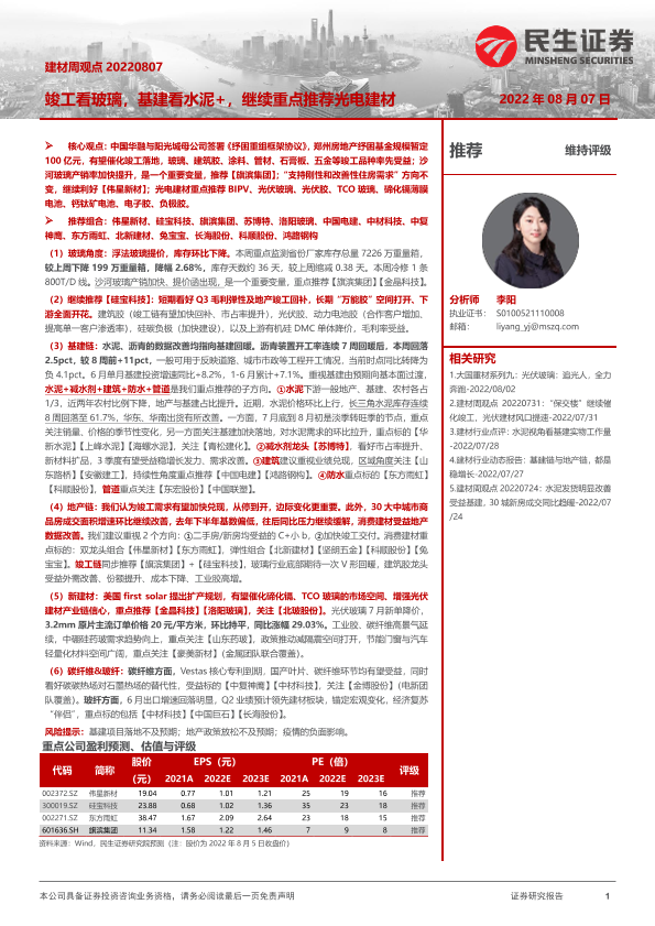 【民生证券】【20220807】建材周观点:竣工看玻璃,基建看水泥+,继续重点推荐光电建材-20页