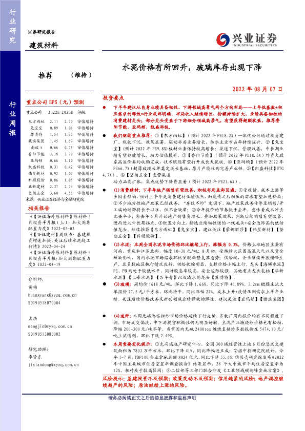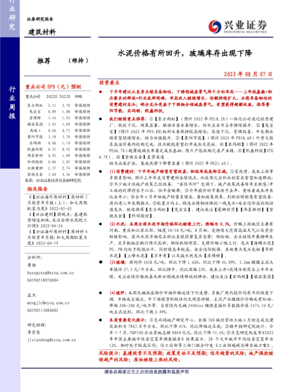 【兴业证券】【20220807】水泥价格有所回升,玻璃库存出现下降-22页