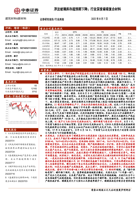 【中泰证券】【20220807】建筑材料&新材料行业周报:浮法玻璃库存超预期下降;行业深度碳碳复合材料-28页