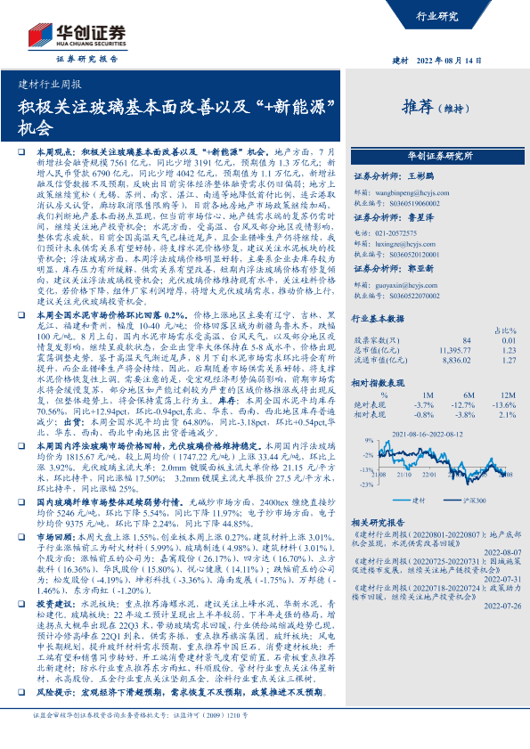 【华创证券】【20220814】建材行业周报:积极关注玻璃基本面改善以及“+新能源”机会-18页