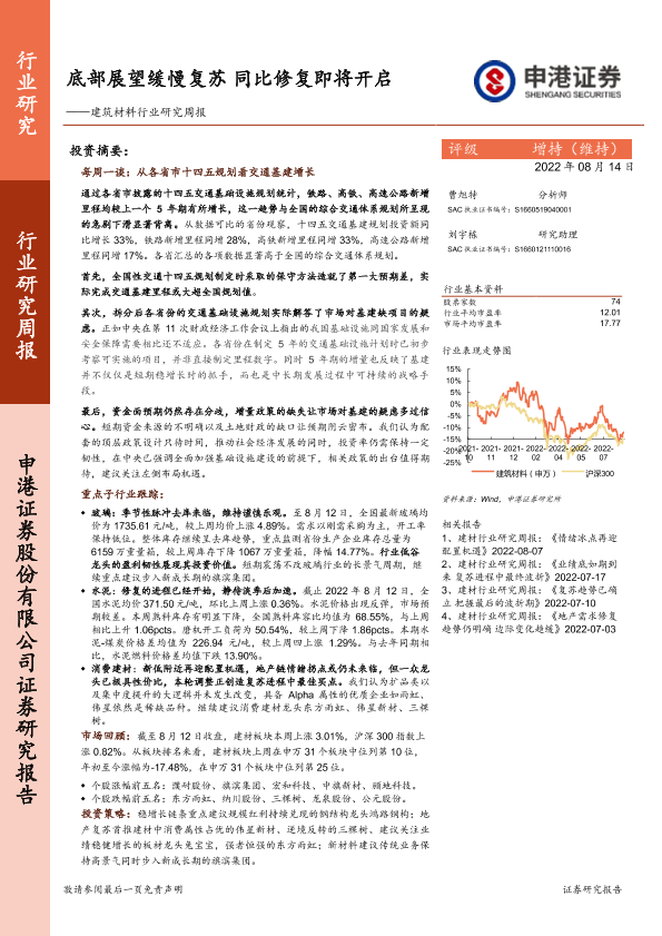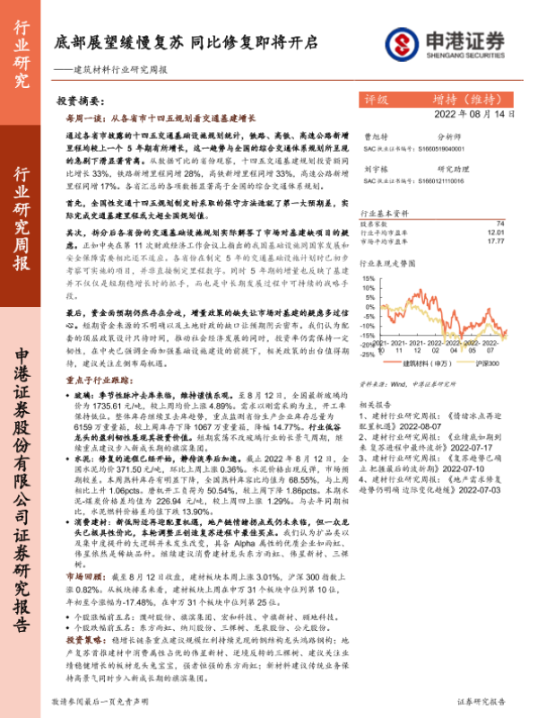 【申港证券】【20220814】底部展望缓慢复苏同比修复即将开启——建筑材料行业研究周报-15页