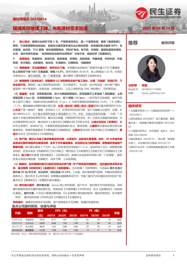 【民生证券】【20220814】建材周观点:玻璃库存继续下降,光电建材需求加速-20页