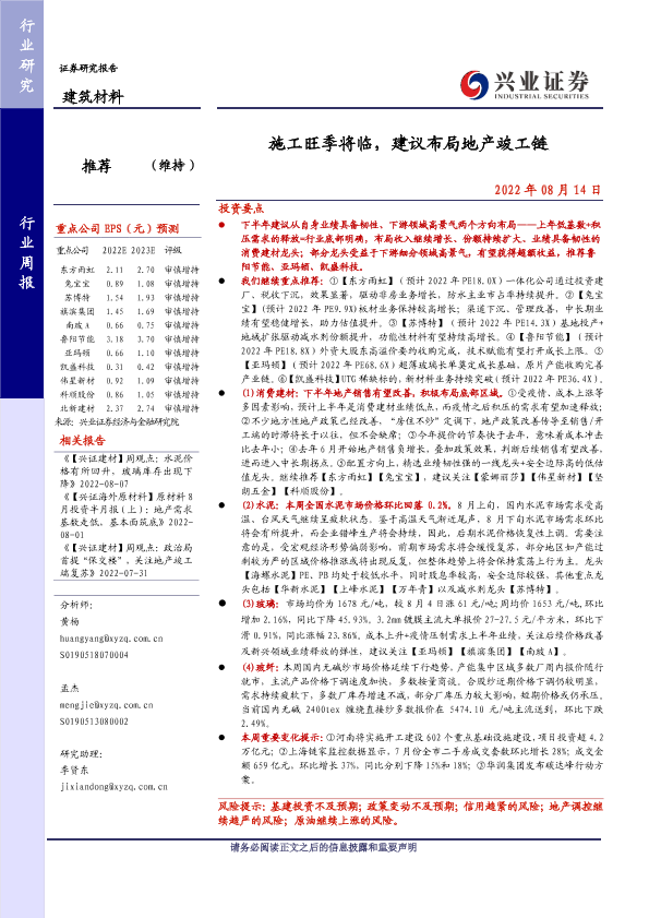 地产竣工链 建筑材料 投资建议 施工旺季 行业周报