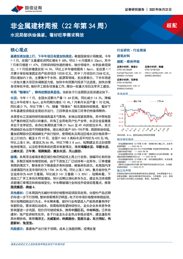 【国信证券】【20220822】非金属建材周报:水泥局部供给偏紧,看好旺季需求释放-21页