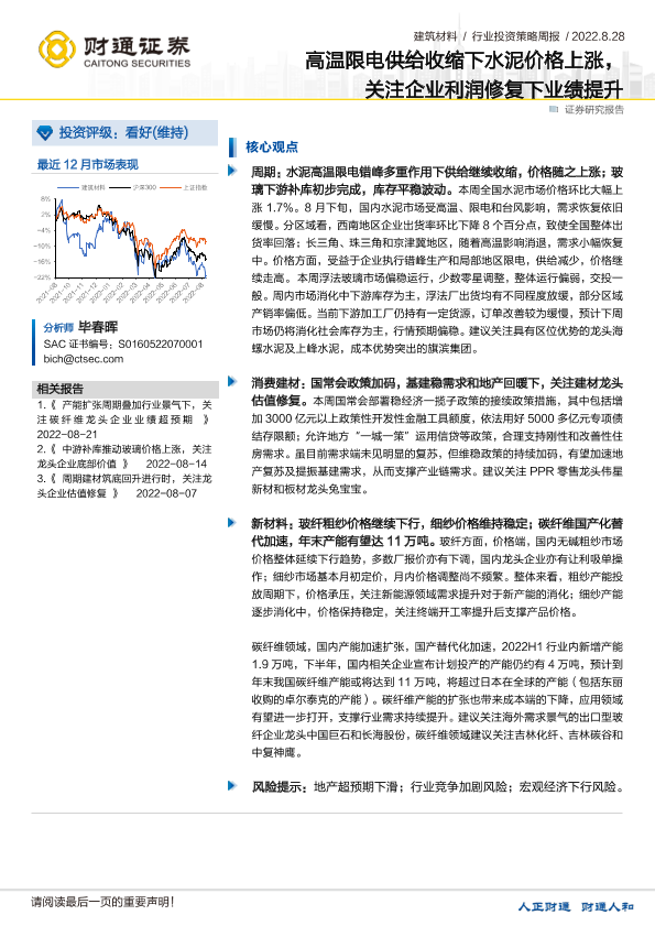 【财通证券】【20220828】建筑材料行业投资策略周报:高温限电供给收缩下水泥价格上涨,关注企业利润修复下业绩提升-5页
