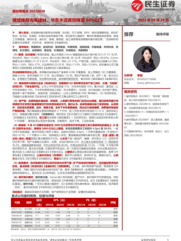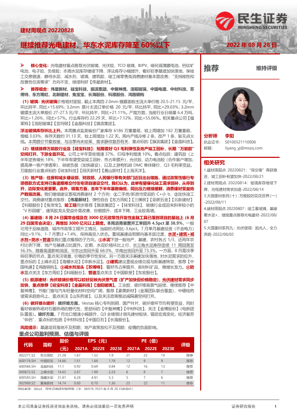 【民生证券】【20220828】建材周观点:继续推荐光电建材,华东水泥库存降至60%以下-22页