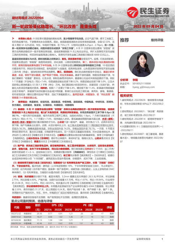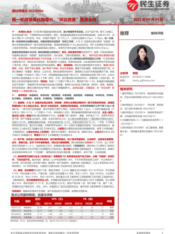 【民生证券】【20220904】建材周观点:新一轮政策催化稳增长,“环比改善”是重头戏-21页