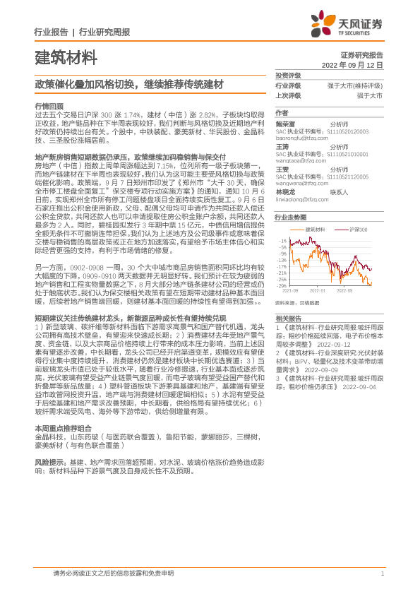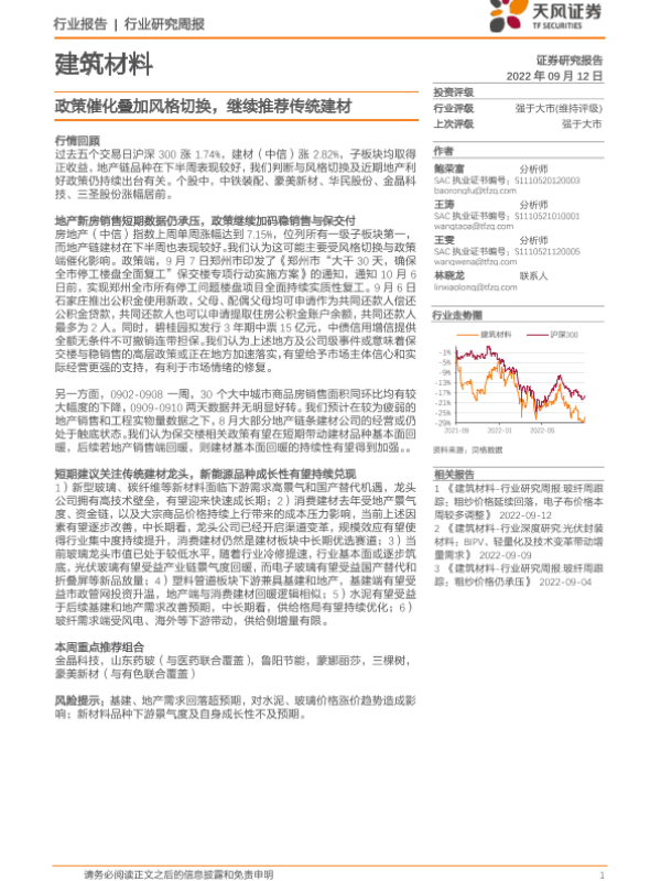 【天风证券】【20220912】建筑材料行业研究周报:政策催化叠加风格切换,继续推荐传统建材-6页