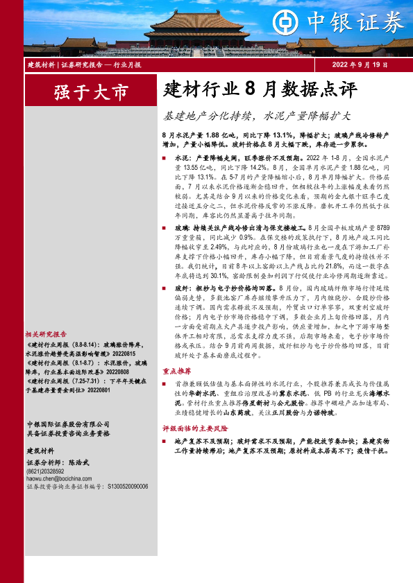 【中银证券】【20220919】建材行业8月数据点评:基建地产分化持续,水泥产量降幅扩大-13页