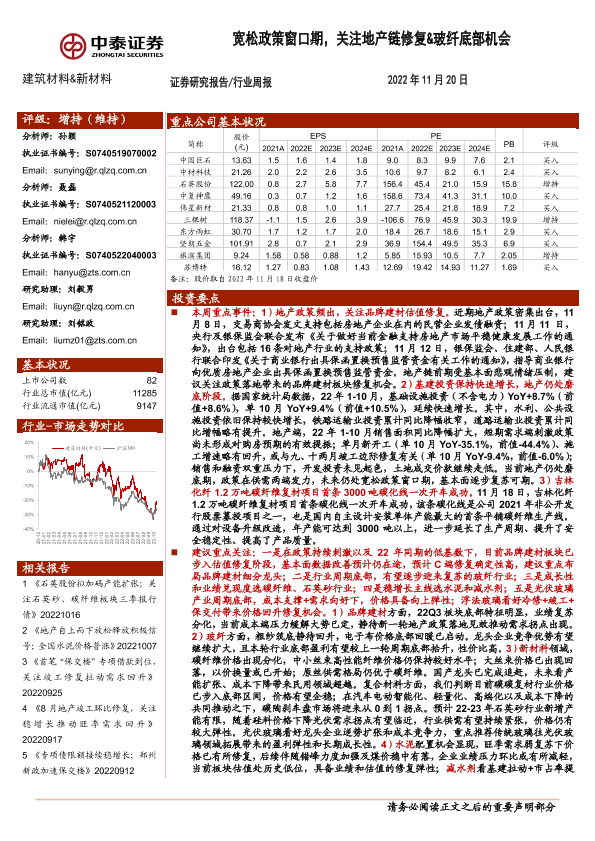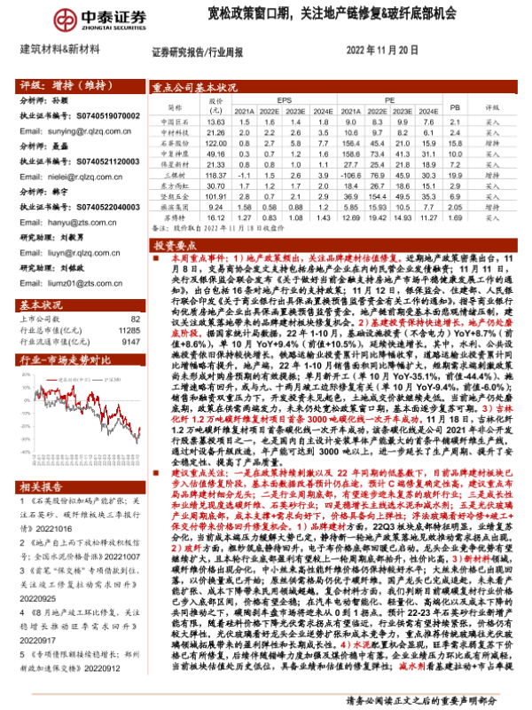 【中泰证券】【20221120】建筑材料&新材料行业周报:宽松政策窗口期,关注地产链修复&玻纤底部机会-26页