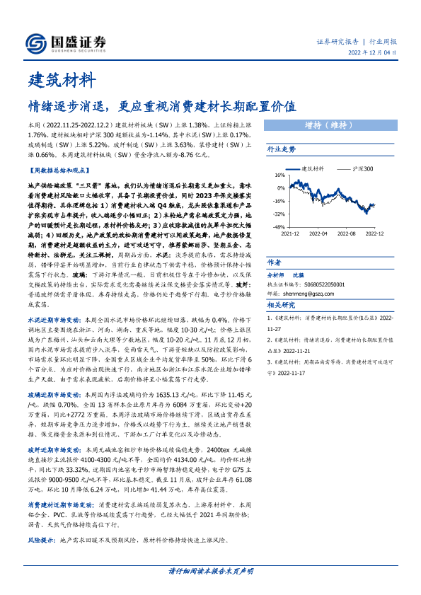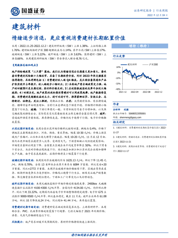 【国盛证券】【20221204】建筑材料行业周报:情绪逐步消退,更应重视消费建材长期配置价值-13页