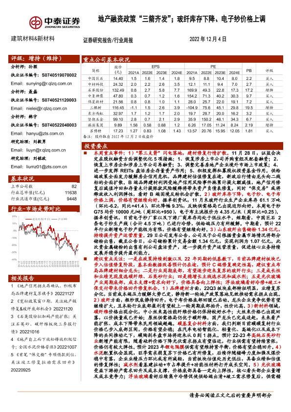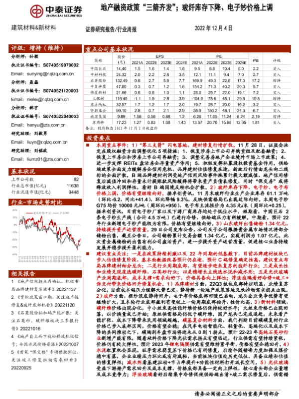 【中泰证券】【20221204】建筑材料&新材料行业周报:地产融资政策“三箭齐发”;玻纤库存下降、电子纱价格上调-25页