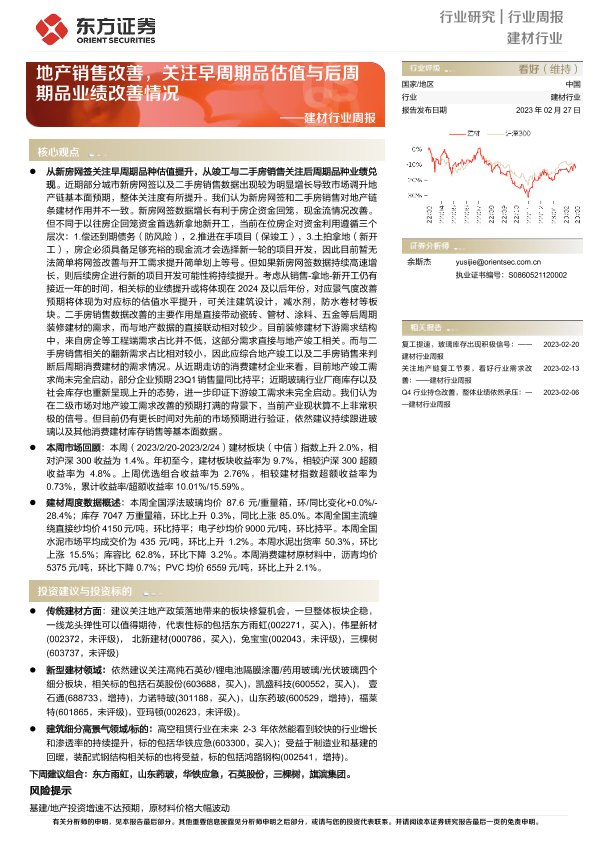 【东方证券】【20230227】建材行业周报:地产销售改善,关注早周期品估值与后周期品业绩改善情况-21页