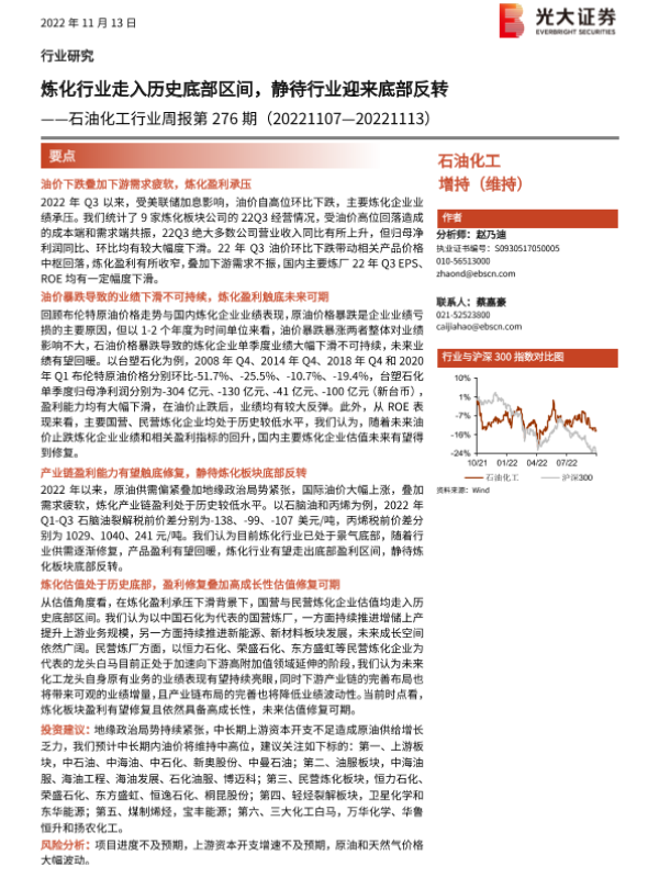 【光大证券】【20221113】石油化工行业周报第276期:炼化行业走入历史底部区间,静待行业迎来底部反转-25页