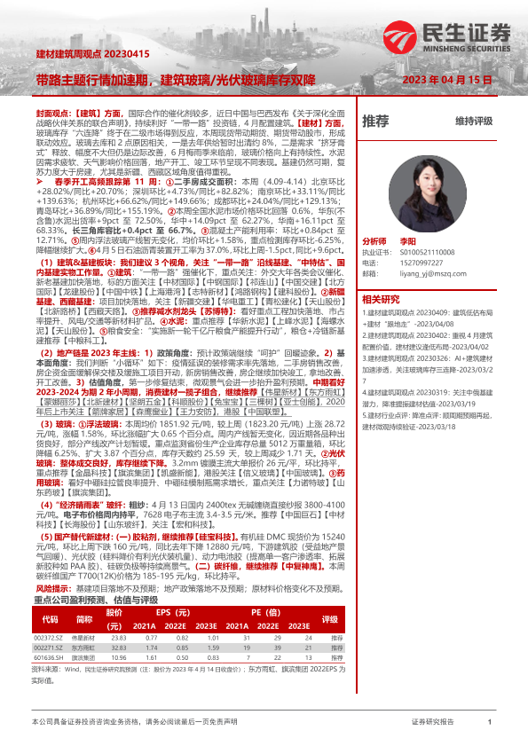【民生证券】【20230415】建材建筑周观点:带路主题行情加速期,建筑玻璃 光伏玻璃库存双降-24页