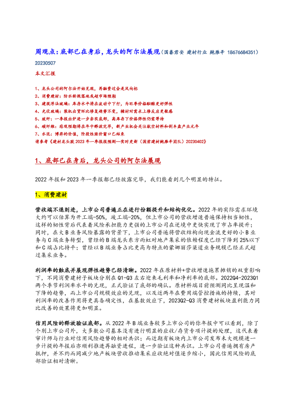 【国泰君安证券】【20230507】建材行业周观点:底部已在身后,龙头公司的阿尔法展现-11页