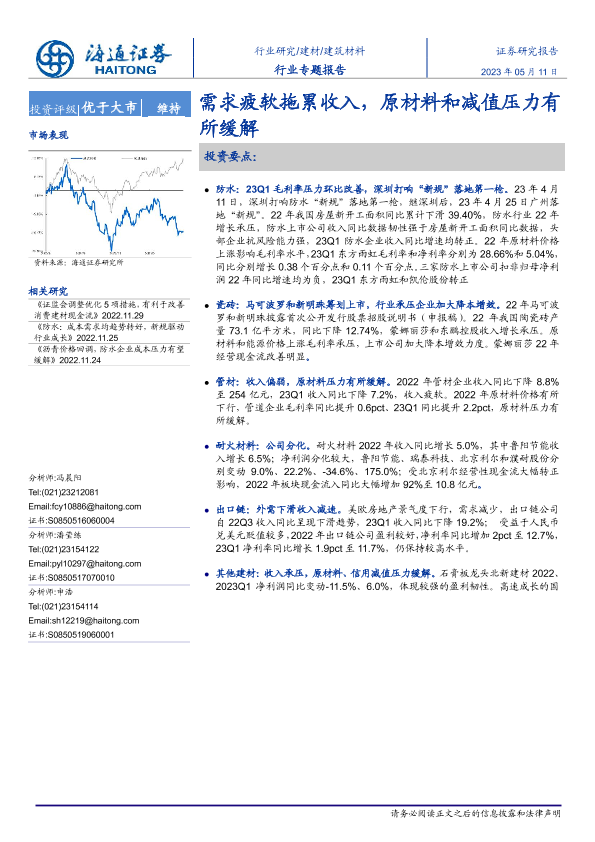 【海通证券】【20230511】建筑材料行业专题报告:需求疲软拖累收入,原材料和减值压力有所缓解-24页