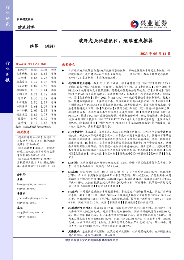 【兴业证券】【20230514】建筑材料行业周报:玻纤龙头估值低位,继续重点推荐-22页