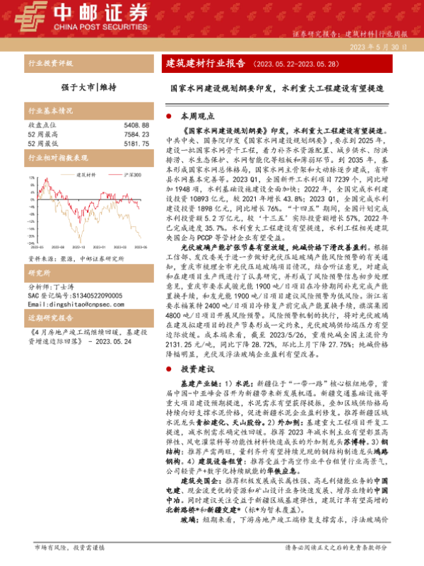 光伏玻璃 建筑材料 投资分析 水利建设 行业周报