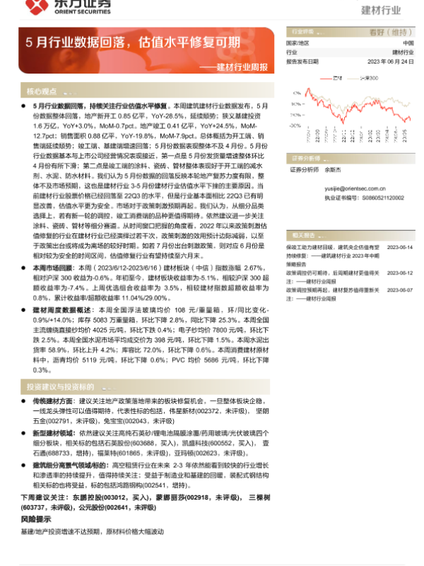 【东方证券】【20230624】建材行业周报:5月行业数据回落,估值水平修复可期-20页