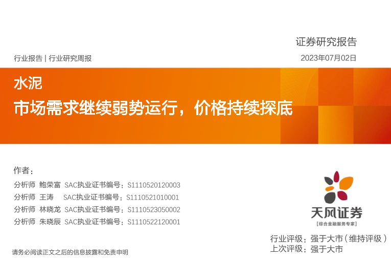 【天风证券】【20230702】水泥行业研究周报:市场需求继续弱势运行,价格持续探底-21页