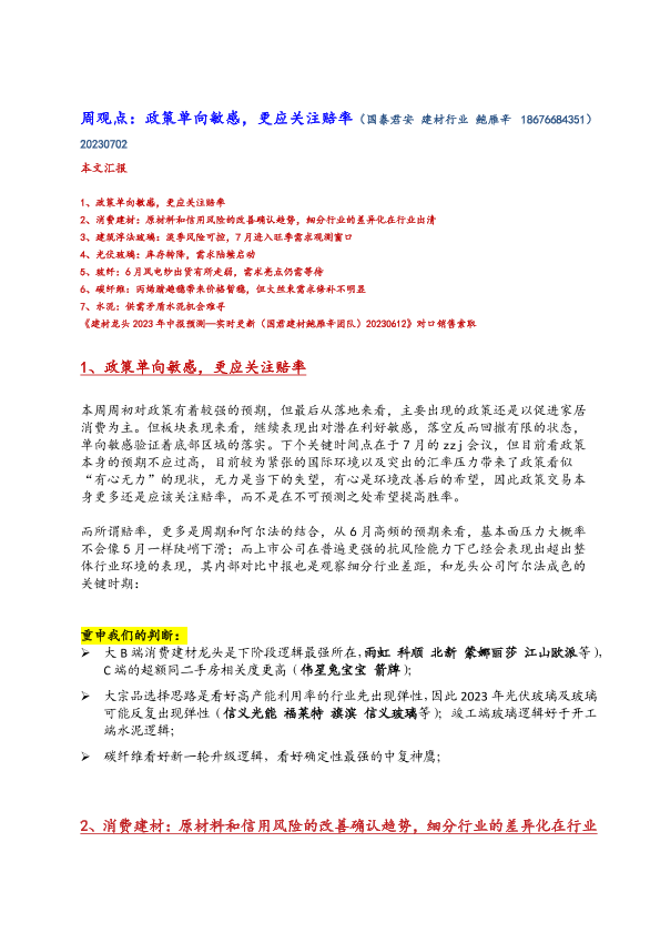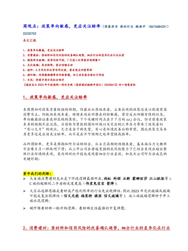 【国泰君安证券】【20230702】建材行业周观点:政策单向敏感,更应关注赔率-14页