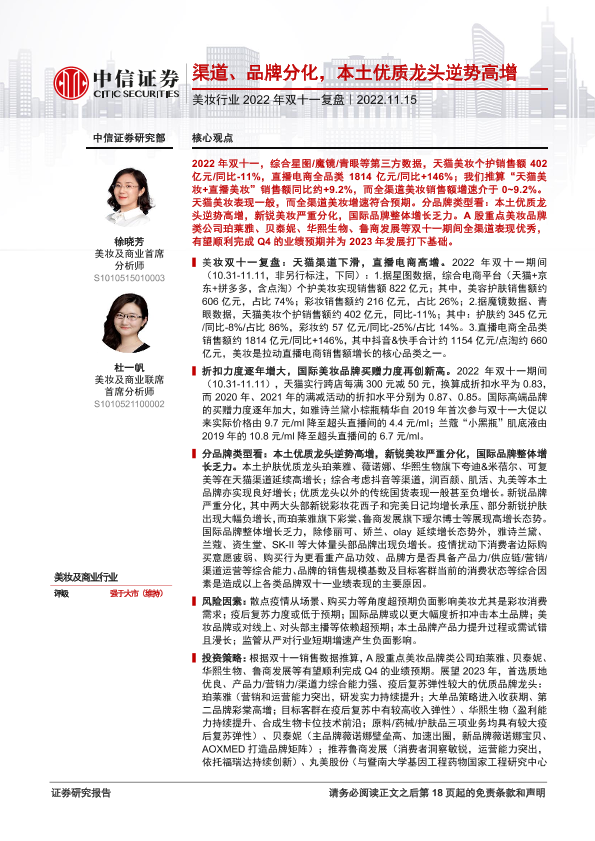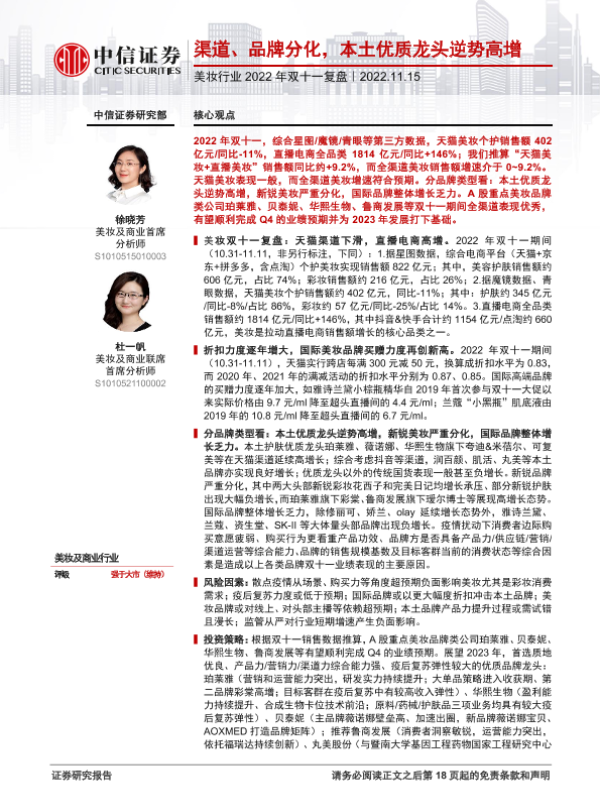【中信证券】【20221115】美妆行业2022年双十一复盘:渠道、品牌分化,本土优质龙头逆势高增-19页