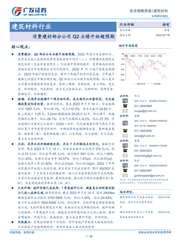 【广发证券】【20230716】建筑材料行业投资策略周报:消费建材部分公司Q2业绩开始超预期-30页