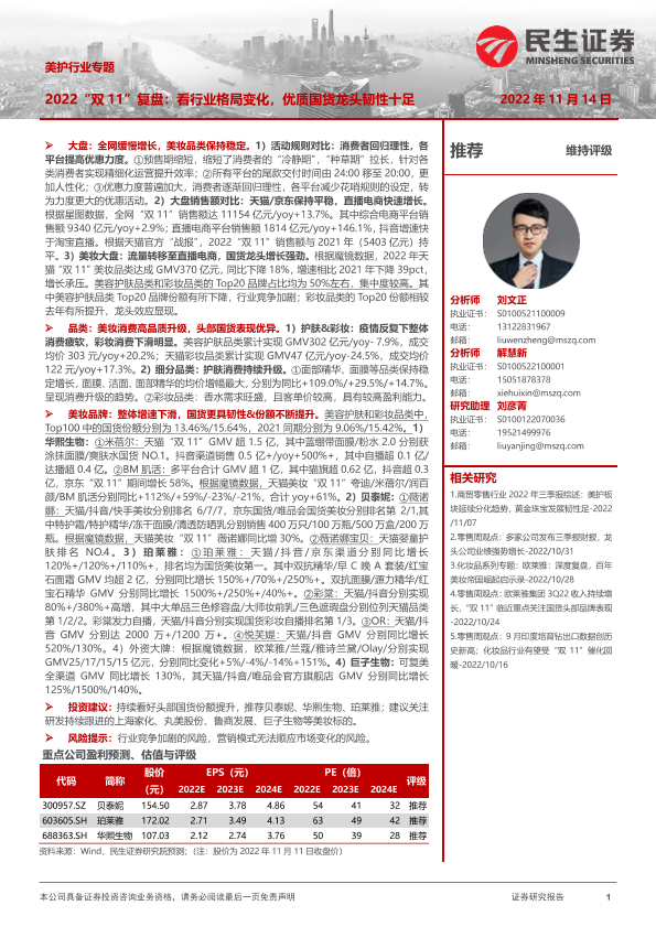 【民生证券】【20221114】美护行业专题:2022“双11”复盘,看行业格局变化,优质国货龙头韧性十足-31页