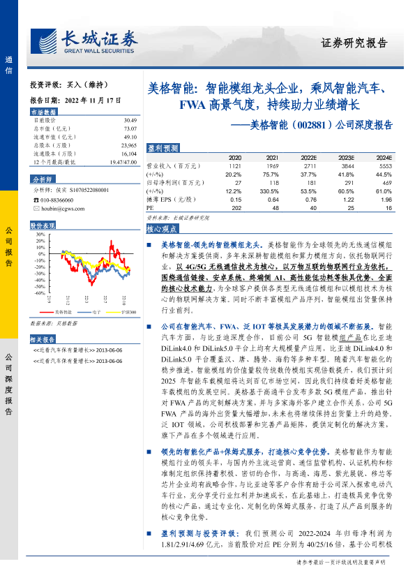 【长城证券】【20221117】美格智能公司深度报告:智能模组龙头企业,乘风智能汽车、FWA高景气度,持续助力业绩增长-32页