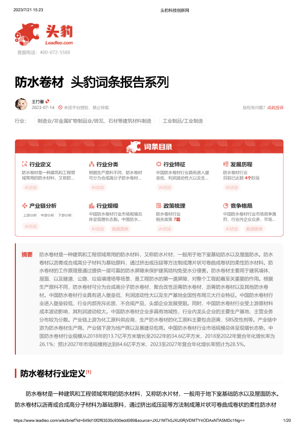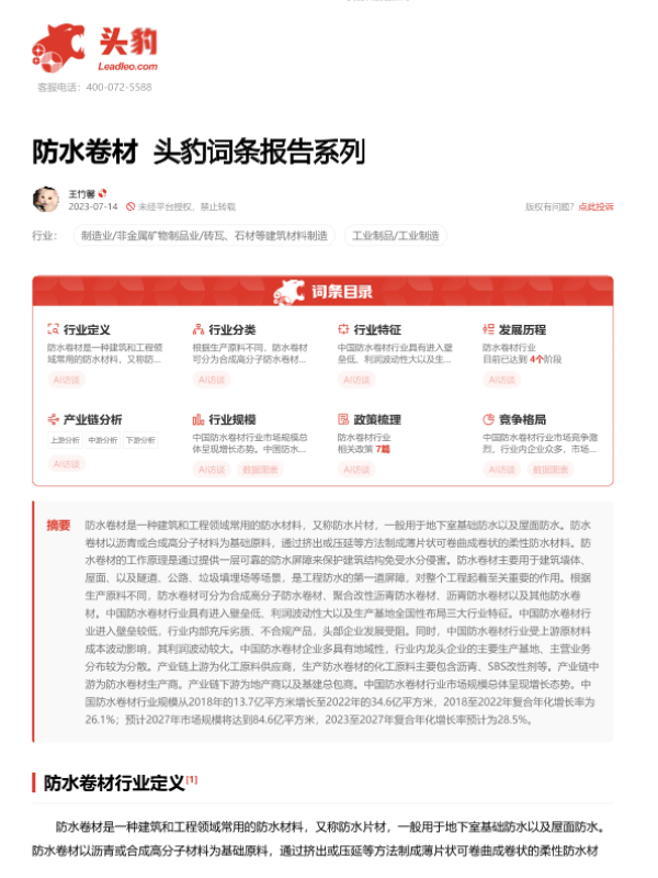 【头豹研究院】【20230714】防水卷材 头豹词条报告系列-20页