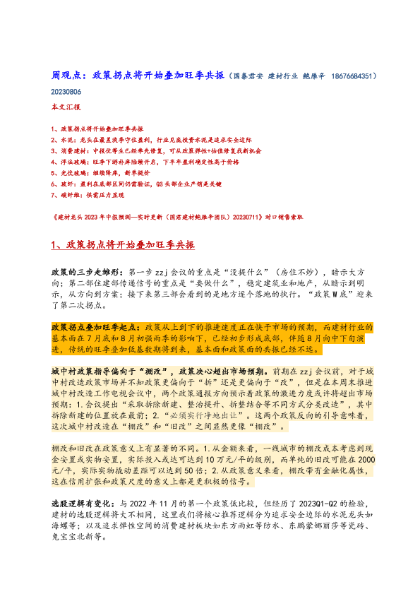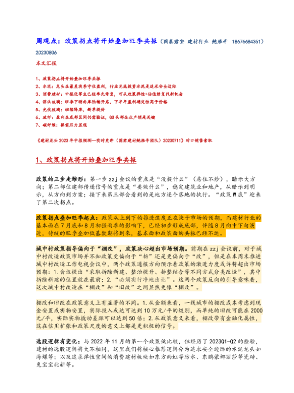 【国泰君安证券】【20230806】建材行业周观点:政策拐点将开始叠加旺季共振-17页