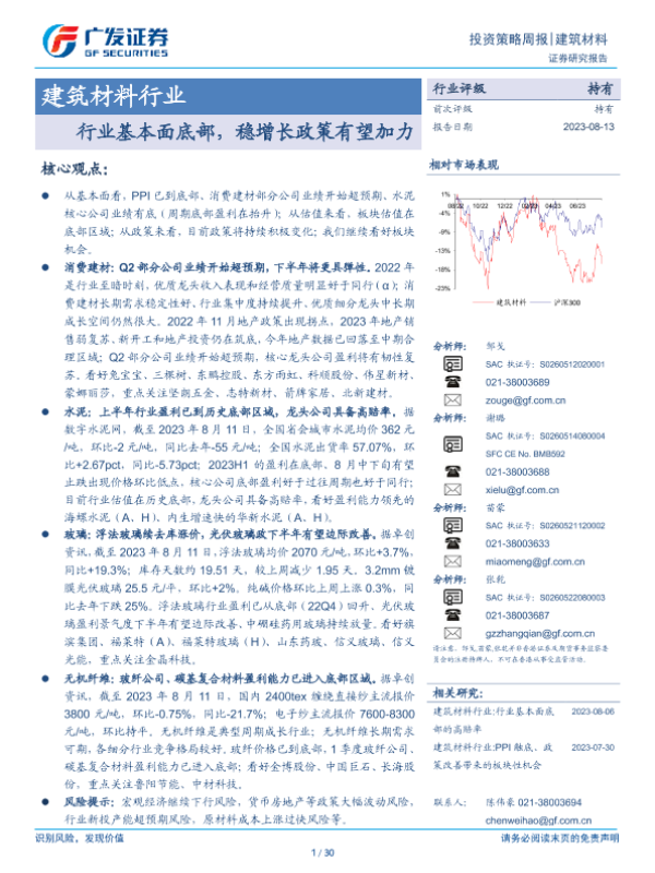 【广发证券】【20230813】建筑材料行业投资策略周报:行业基本面底部,稳增长政策有望加力-30页