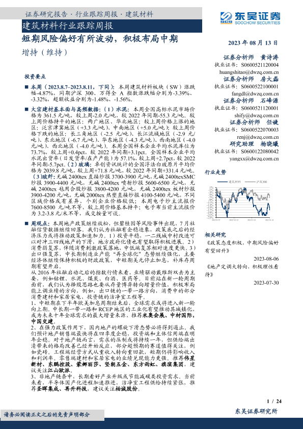【东吴证券】【20230813】建筑材料行业跟踪周报:短期风险偏好有所波动,积极布局中期-24页