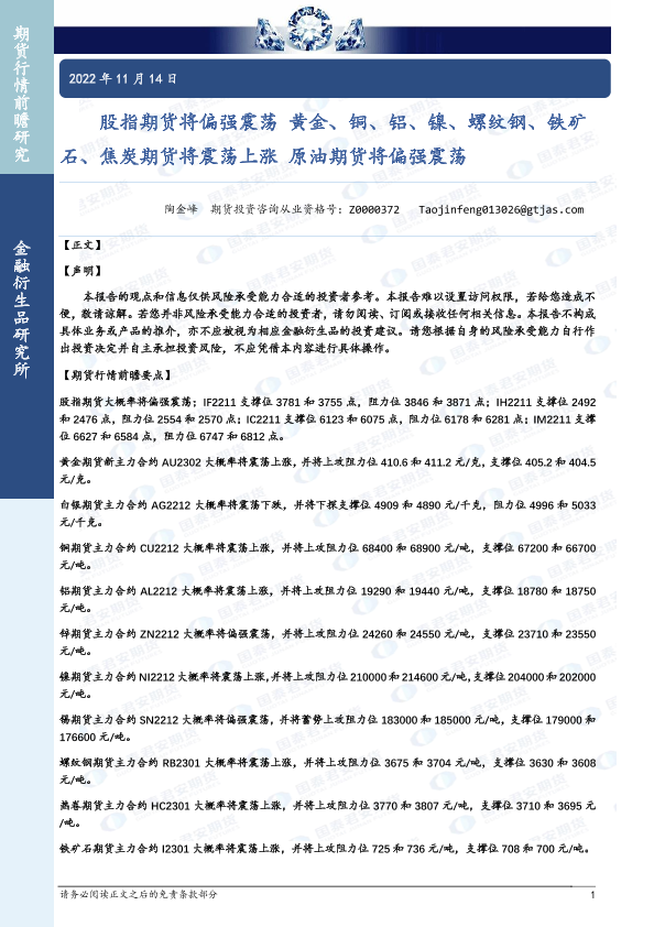【国泰君安期货】【20221114】股指期货将偏强震荡,黄金、铜、铝、镍、螺纹钢、铁矿石、焦炭期货将震荡上涨,原油期货将偏强震荡-44页