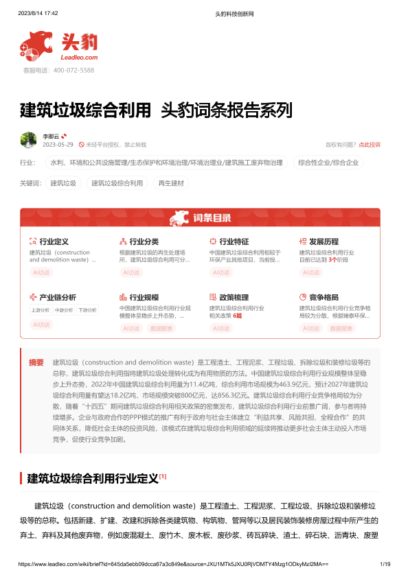 【头豹研究院】【20230814】建筑垃圾综合利用 头豹词条报告系列-19页
