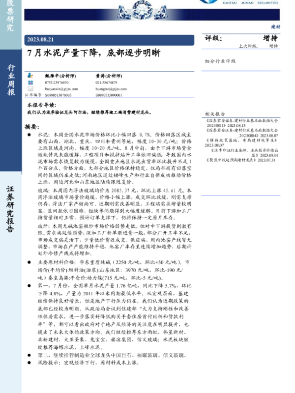 【国泰君安证券】【20230821】7月水泥产量下降,底部逐步明晰-25页